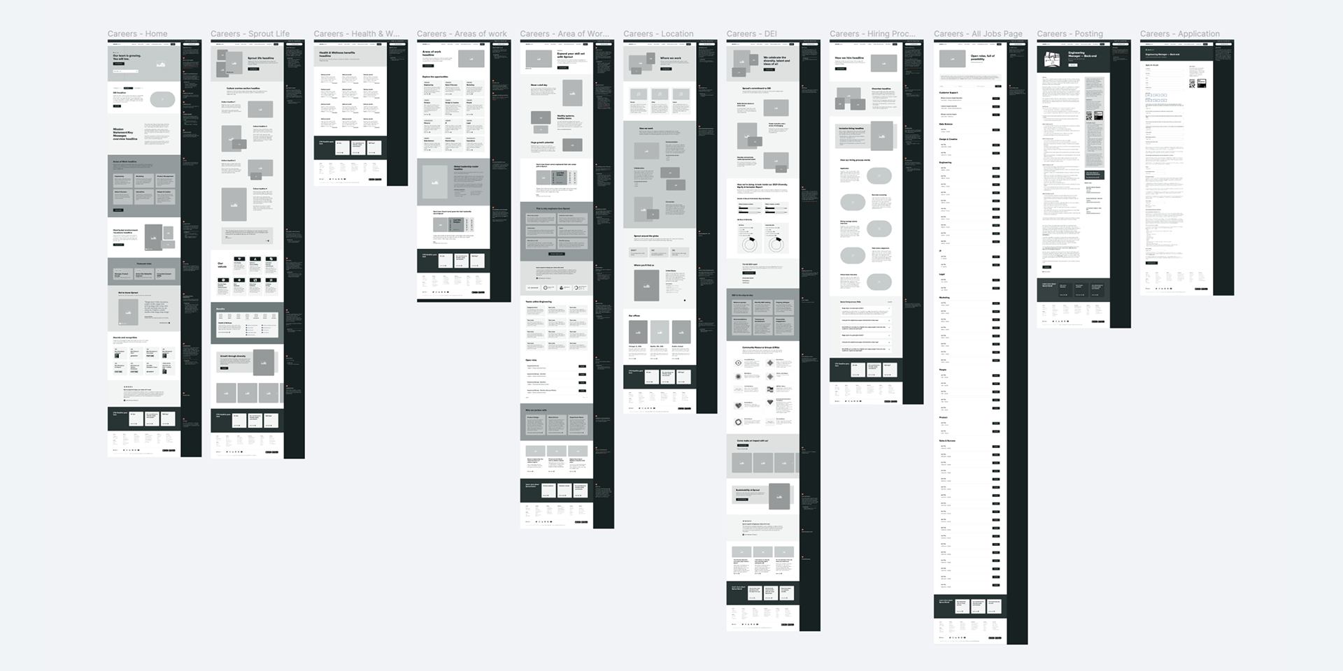 Before this project began, I had to sell the need for the massive increase in scope from a light re-skin of the previous version of the Sprout Social Careers site. I did extensive competitor research and built an 11 page wireframe to pitch the project to Sprout’s VP of Brand Creative, Chief Creative Officer, and Chief People Officer.